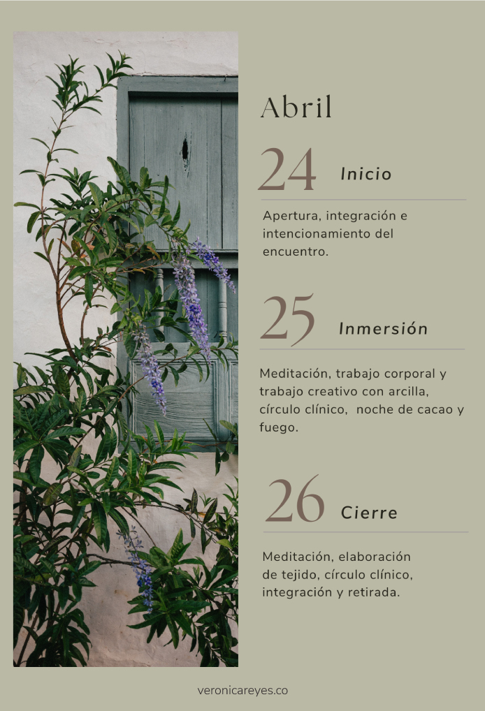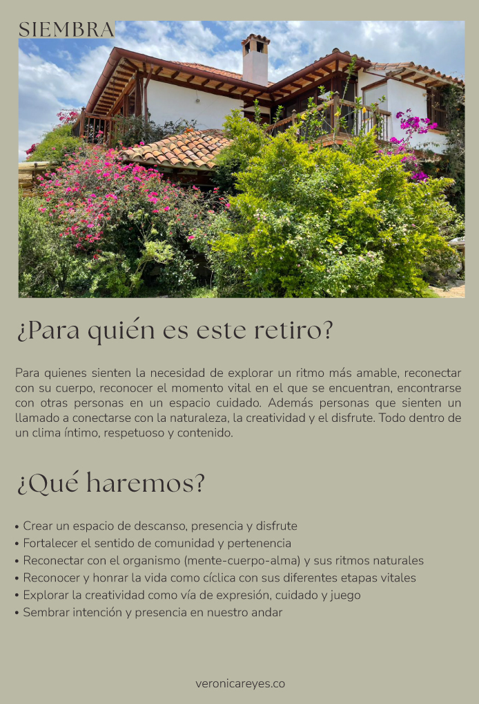 En este retiro presencial en Villa de Leyva, tendremos dos días de comunidad, cu para volver al cuerpo, reconectar con la etapa vital en la que nos encontramos, el movimiento y acompañarnos en esto. Un espacio para encontrarnos en comunidad, descansar sin culpa, disfrutar sin exigencia y honrar nuestras necesidades reales.