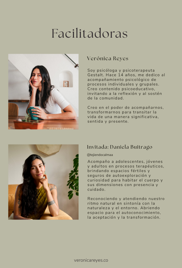 ❀ Puedes separar tu espacio realizando el pago en dos partes, escríbenos a hola@veronicareyes.co para colaborarte con la inscripción.