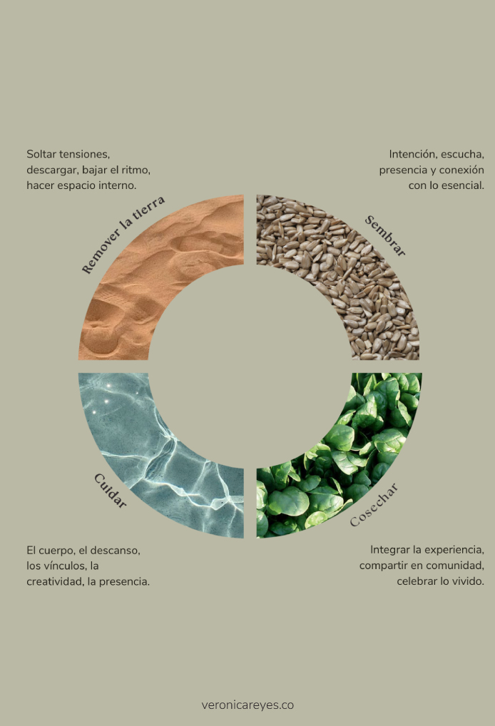Un espacio para encontrarnos en comunidad, descansar sin culpa, disfrutar sin exigencia y honrar nuestras necesidades reales. A través de prácticas corporales, creativas y rituales, vamos a identificar y validar lo cíclico de estar vivas, como movimientos de la naturaleza que somos, vamos a recorrer las etapas para darnos permiso y contención: remover la tierra, sembrar, cuidar y cosechar.